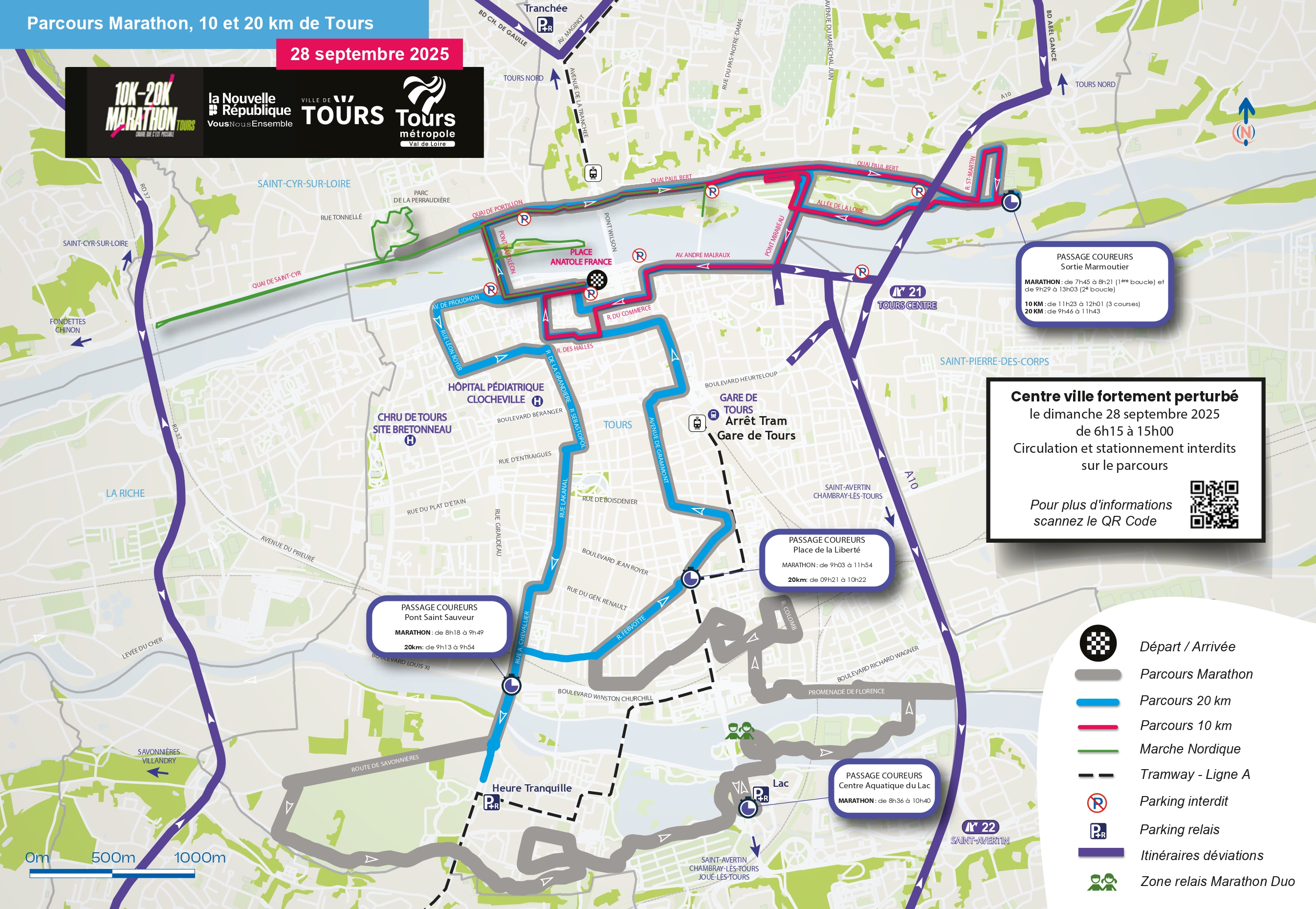Afin de garantir le bon déroulement de la course, la circulation et le stationnement seront réglementés et/ou interdits sur l’ensemble du parcours, le samedi 27 septembre et dimanche 28 septembre. Découvrez ci-dessous la carte réalisée par Tours Métropole pour anticiper vos déplacements ! Et pour plus de détail, consultez l'application 👉 cliquez ICI