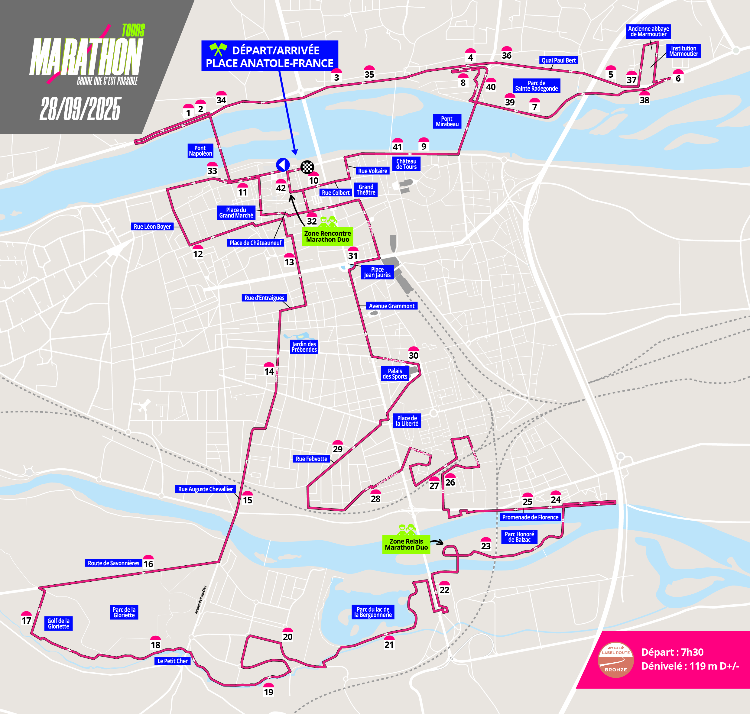Le Marathon de Tours propose un parcours 100% urbain captivant. Que tu choisisses de relever ce défi en solo ou en duo, tu exploreras les trésors du patrimoine de Tours et apprécieras la beauté naturelle des bords de Loire et du Cher en plein cœur de ville. Découvre son parcours 100% urbain !